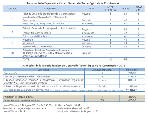 Ofrecer una formación como profesional de alto nivel en el área del Desarrollo Tecnológico de la Construcción Sostenible, que permita al egresado desarrollar proyectos y aplicación en nuevas tecnologías y materiales de construcción, dirigidos a egresados con grado de Licenciado o equivalente, están destinados al logro de la formación requerida para aplicar, evaluar y desarrollar conocimientos, métodos y técnicas. Consisten en cursar asignaturas, cumplir otras actividades curriculares organizadas en áreas específicas o integradas del conocimiento y realizar, defender y aprobar un Trabajo Especial de Grado. Estos estudios culminan con la obtención del grado académico de Especialista en el área del conocimiento respectivo.