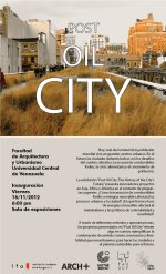 Post-Oil City: The History of the City's Future El Taller X se complace en invitar a la inauguración de la muestra Post-Oil City: The History of the City's Future, este viernes 16 de noviembre a las 6:00 pm, en la sala de exposiciones de la Escuela de Arquitectura Carlos Raúl Villanueva. Patrocinada por el Goethe Institut, IFA y la revista ARCH+, la muestra presenta innovadores proyectos en el área de diseño, arquitectura y paisajismo en el marco de importantes preguntas sobre el futuro de la ciudad en una era post-combustibles fósiles que apenas comienza hoy día. |