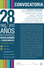 LA Revista Tecnología y Construcción INVITA A PROFESIONALES, INVESTIGADORES, ESTUDIANTES DE PRE Y POSTGRADO, GERENTES Y EMPRESARIOS DEL SECTOR PÚBLICO Y PRIVADO A PUBLICAR ARTÍCULOS RESULTADOS DE INVESTIGACIÓN DENTRO DEL ÁREA DE LA ARQUITECTURA Y LA CONSTRUCCIÓN La revista Tecnología y Construcción, es una publicación editada por el Instituto de Desarrollo Experimental de la Construcción de la Facultad de Arquitectura y Urbanismo de la Universidad Central de Venezuela. Nace en 1985 con el objetivo de promover la producción científica y tecnológica de la comunidad universitaria mediante la divulgación de artículos originales y de revisión. Se especializa en textos inscritos dentro del campo de la Investigación y el Desarrollo Tecnológico de la Construcción tales como: aspectos históricos, económicos, sociales y administrativos de la construcción; métodos de diseño y sistemas de producción; habitabilidad, calidad y equipamiento de las edificaciones; materiales de construcción y productos; análisis de proyectos de arquitectura; ciencia, tecnología e informática asociados a la investigación y desarrollo en el campo de la construcción; reseñas bibliográficas y de eventos. + INFORMACIÓN EN: Revista tyc @revistatyc tycidec@gmail.com www.fau.ucv.ve/idec http://saber.ucv.ve/ojs/ |
