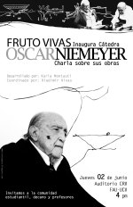 CÁTEDRA OSCAR NIEMEYER Los invitamos a una charla que Fruto Vivas dará en el auditorio Carlos Raúl Villanueva de la FAU, acerca de la obra de Oscar Niemeyer, como inauguración a la apertura de la cátedra Oscar Niemeyer el próximo semestre Fecha: 02 de junio a las 4pm |