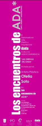 El sábado 07 de julio a las 10:30 AM en el Auditorio de la Facultad de Arquitectura y Diseño de la Universidad del Zulia se realizará la sexta sesión del ciclo de conferencias y videoconferencias "Los encuentros de ADA" organizado por el Diplomado en Arte, Diseño y Arquitectura DADA, el Laboratorio y taller del Verbo Arquitectura, el Departamento de Teoría y Práctica de la Arquitectura y el Diseño, La Coordinación de Extensión de Arquitectura y Diseño, la Facultad de Arquitectura y Diseño de la Universidad del Zulia. Para esta ocasión la invitada es Ofelia Soto, artista plástico y crítico de arte, fue miembro del Consejo Directivo del Centro de Bellas Artes de Maracaibo, miembro fundador de la Sociedad de Amigos del Centro de Arte de Maracaibo Lía Bermúdez, CAM-LB artista fundador del CAM-LB, miembro N°35 de la Asociación Internacional de Críticos de Arte, AICA. Capítulo Venezuela, entre otras formas de incursionar en las ARTES |